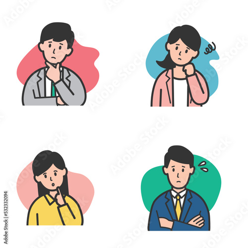 悩む、考える、困る、疑問に感じる働く人々のイラストセット・カラー