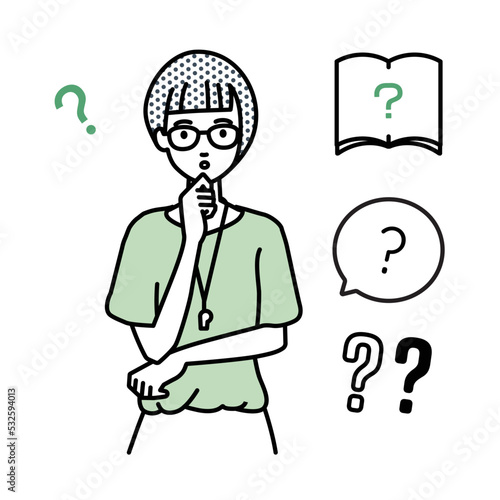 立って手をあごにあてて疑問を感じている教師の女性 クエスチョンマークのセット