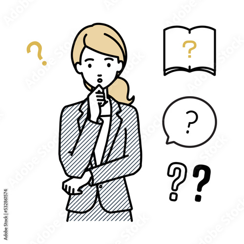 立って手をあごにあてて疑問を感じているスーツの女性 クエスチョンマークのセット