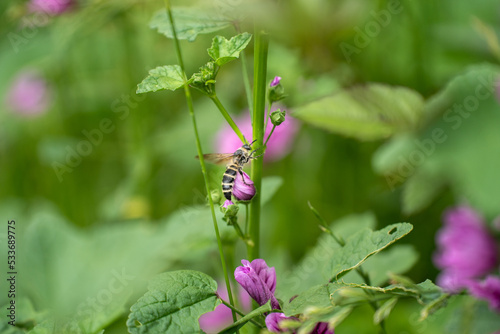 初夏のウスベニアオイを渡り飛ぶハチ