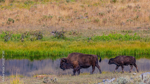 バイソンの親子 野生動物 アメリカ イエローストーン国立公園