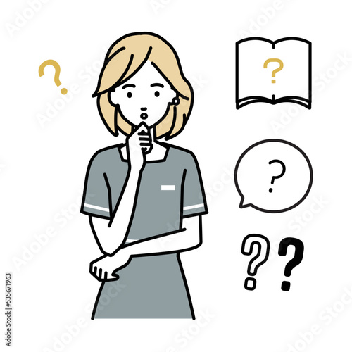 立って手をあごにあてて疑問を感じているエステ店員・受付・接客係の女性 クエスチョンマークのセット