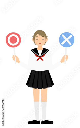 白いセーラー服を着た女子生徒、質問回答用のマルバツ棒を持つ