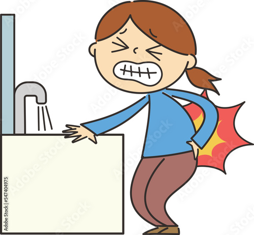洗面所で顔を洗う時に、腰に痛みが走った女性のイラスト