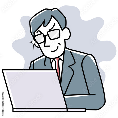 パソコンを見ながらほくそ笑むスーツ姿の男性