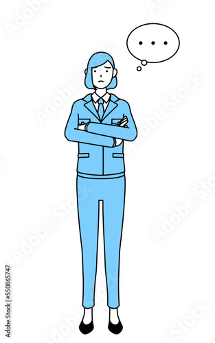 腕を組んで考える作業着を着た女性のシンプルな線画イラスト