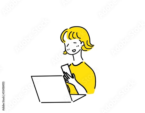 ノートパソコンの前で携帯電話を見る女性