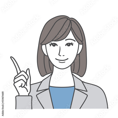 指差しポーズでポイントを説明をするスーツを着た女性のイラスト素材 グレー
