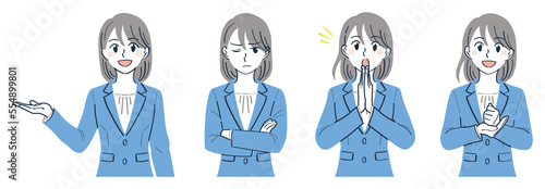 ビジネススーツの女性 表情ポーズの上半身イラストセット(案内する イライラする 気づく 納得)