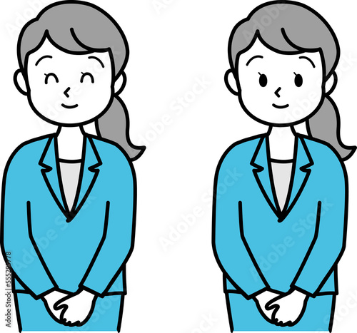 イラスト素材:スーツの女性が笑顔で受付で対応する様子 上半身 セット 線画 単色(透過背景)