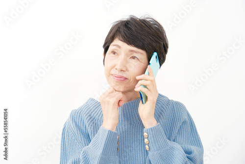スマホで電話して考える中年女性 白背景
