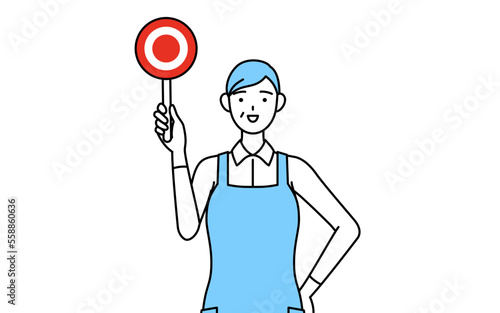 正解を示すマルの棒を持つエプロンを着たシニア女性
