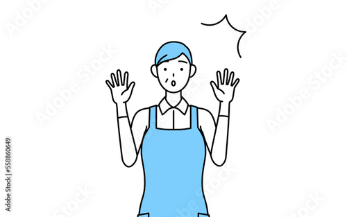 驚いて手を上げるエプロンを着たシニア女性