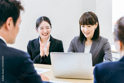 オフィスでノートパソコンを使って会議するキャリアウーマンの女性
