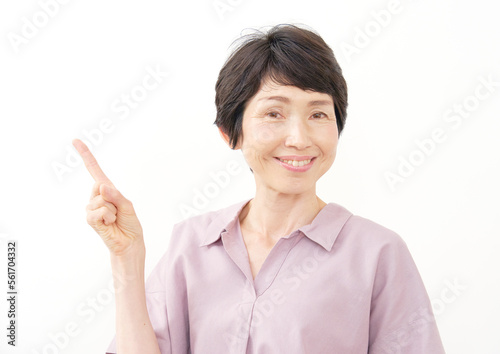左を指差す中年女性 白背景