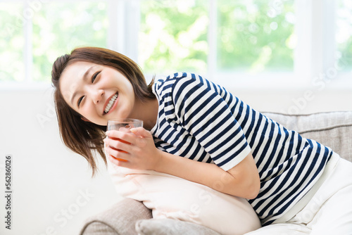 部屋でリラックスする若い女性 飲み物