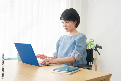 家でパソコンを使う車椅子に乗った障がい者女性