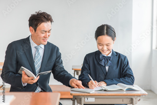 学校・塾で個別指導・マンツーマン指導する中学生・高校生・小学生と先生・教師・塾講師