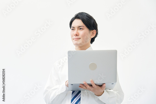 パソコンを持つビジネスマンのポートレート 白背景