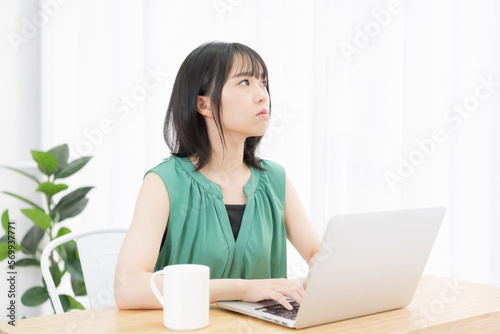 パソコンを使いながら外を見上げる若い女性
