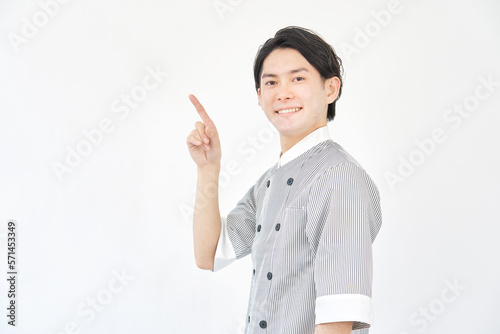 左を指差すコックコートを着た男性 白背景 (パティシエ・コック・シェフ・洋菓子店店員)