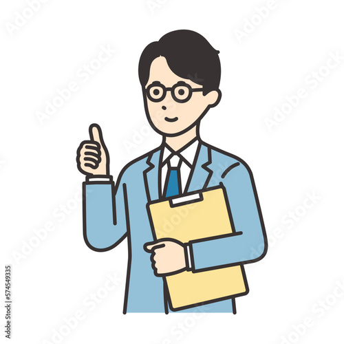 資料を持ってグッドポーズをするスーツを着た男性のイラスト素材
