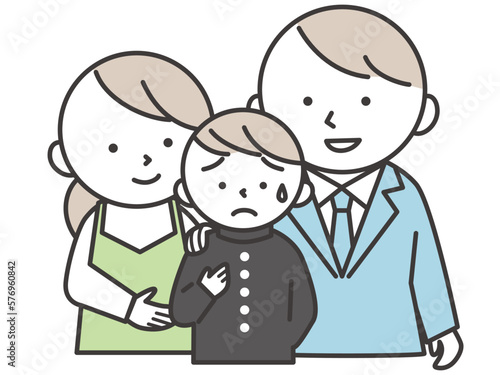 学ランを着た不安そうな男子学生と彼を励ます両親