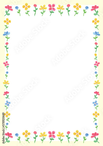 周囲を小ぶりな赤青黄色の水彩手描きの花で飾ったフレーム