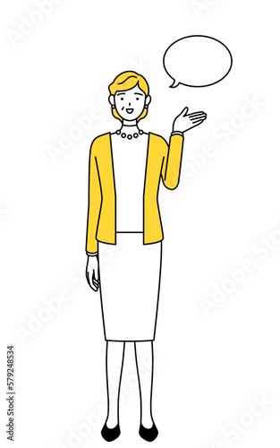 ふきだしつき、案内をする定年退職したシニア・中年女性
