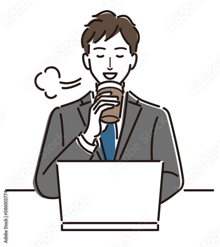 ノートパソコン コーヒーブレイク 休憩するビジネスマン 男性 会社員