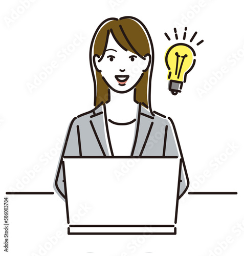 ノートパソコン 電球 ひらめく女性 女性ビジネスパーソン 会社員