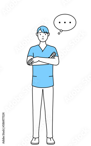 腕を組んで考える男性看護師、理学療法士、作業療法士、言語聴覚士、看護助手