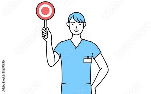 正解を示すマルの棒を持つ男性看護師、理学療法士、作業療法士、言語聴覚士、看護助手