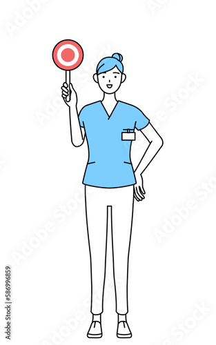 正解を示すマルの棒を持つ女性看護師、理学療法士、作業療法士、言語聴覚士、看護助手