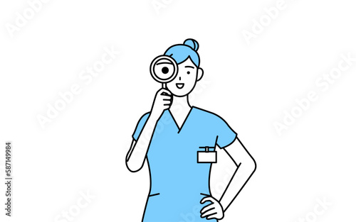 虫メガネをのぞく女性看護師、理学療法士、作業療法士、言語聴覚士、看護助手