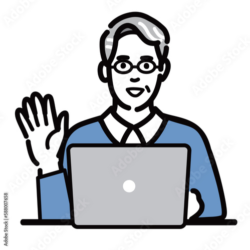 ラップトップの前に座って手を挙げて笑顔で挨拶しているメガネをかけたシニア男性