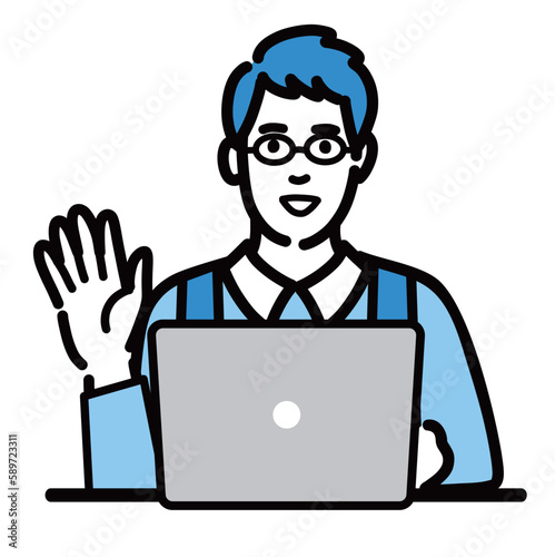 ラップトップの前で手を挙げて笑顔で挨拶しているメガネをかけている主夫