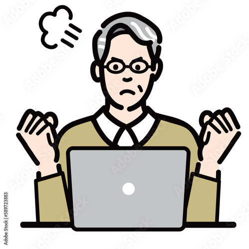 ラップトップの前に座って怒っているメガネをかけたシニア男性