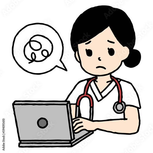 パソコン作業をしている看護師の女性が困っている