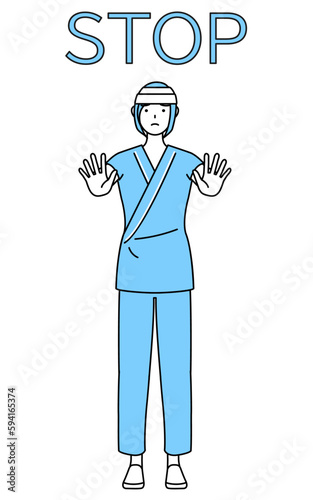 ストップの合図、体の前に手を突き出す頭に包帯を巻いた女性入院患者
