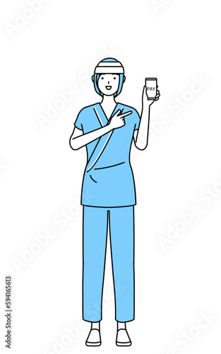スマホのキャッシュレス・オンライン決済を勧める頭に包帯を巻いた女性入院患者
