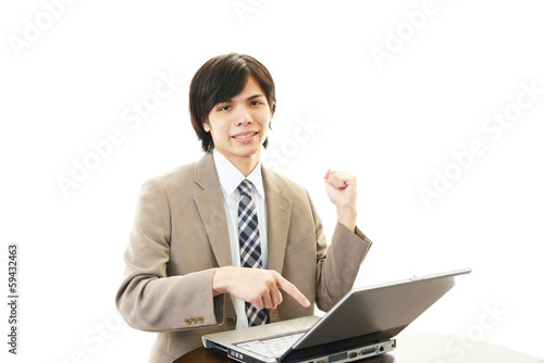 personal computer, man, man, smile, people, success, businessman, business, health, happy, happiness, japanese, glory, hope, raise, achievement, victory, promotion, face, hair, courage, tenacity, cosmetic, model, healthful, good-looking, office, light, clean, white background, copy space, pose, work, uniform, adult, expression, japan, corporate, employee, adult, work