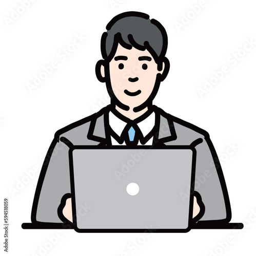ラップトップの前で笑顔のスーツを着た若い男性