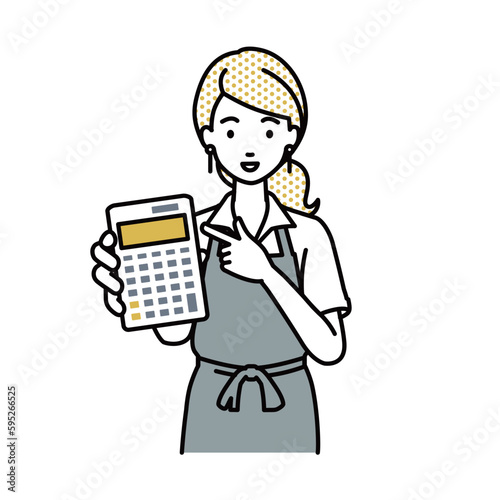 立って電卓を指差してこちらに向けて見せているエプロンをした店員の女性