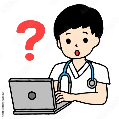 パソコン作業をしている看護師の男性が疑問を抱いている