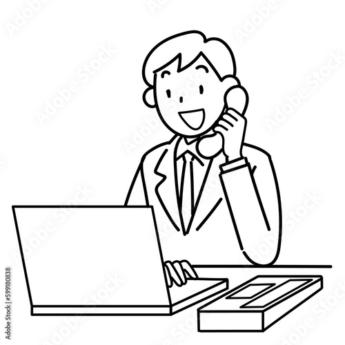 パソコンを見ながら笑顔で電話対応するビジネスマン