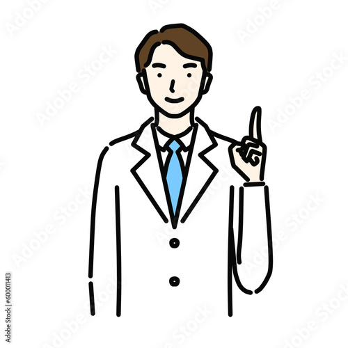 指を立てたポーズをする白衣の男性