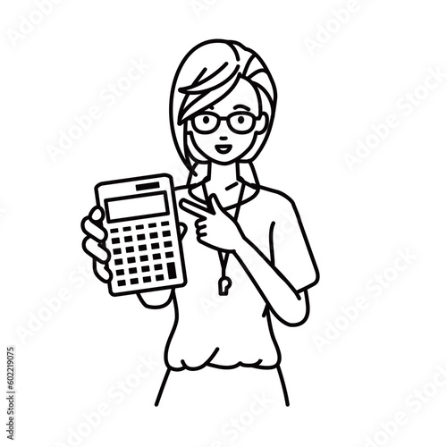 立って電卓を指差してこちらに向けて見せている教師の女性