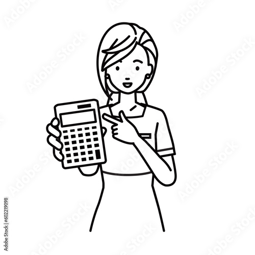 立って電卓を指差してこちらに向けて見せているエステ店員・受付・接客係の女性