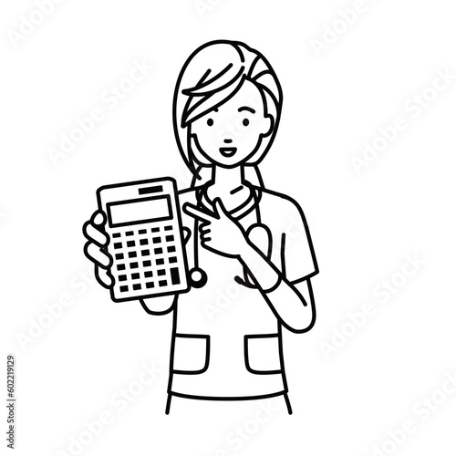 立って電卓を指差してこちらに向けて見せている看護師の女性